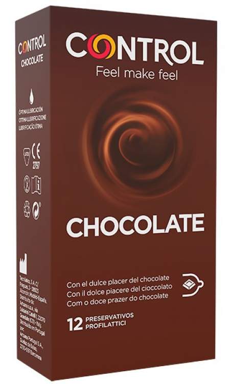 Control Chocolate é dedicado a quem, nos momentos de intimidade, quer despertar todos os cinco sentidos. Graças ao aroma de chocolate, oferece à relação um sabor intenso e delicioso. Preservativos em látex natural de cor castanha, forma anatómica, 19cm de comprimento, 5,4cm de largura e 0,007cm de espessura.