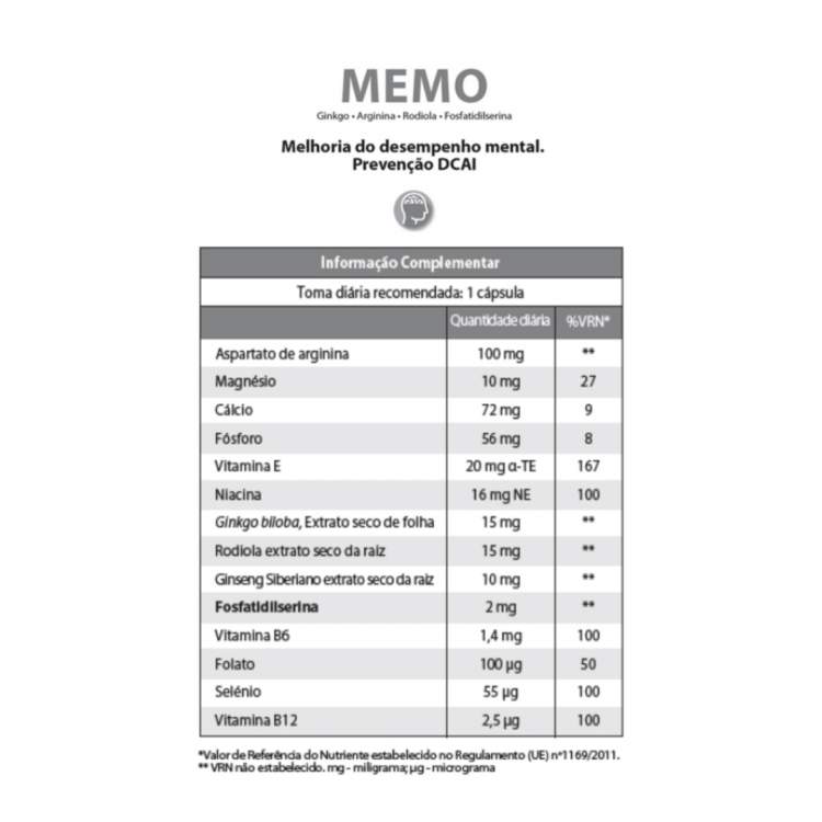 Suplemento alimentar que contribui para a normal função psicológica, melhora a oxigenação cerebral, reduz o cansaço e fadiga e previne o declínio cognitivo. Formula à base de Ginkgo, Arginina, Rodiola, Fosfatidilserina, Magnésio e Vitaminas. Tomar 1 cápsula por dia.