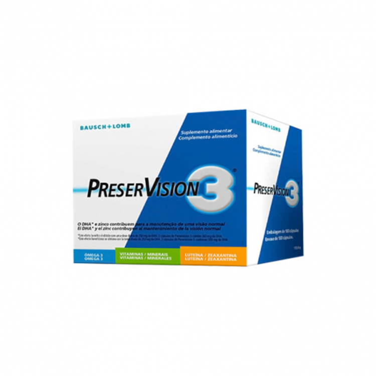 PreserVision 3 é um suplemento alimentar que ajuda a prevenir a degeneração ocular e proteger a visão. Contém Ómega 3, Vitaminas, Minerais e Luteína. Posologia: 2 cápsulas por dia.